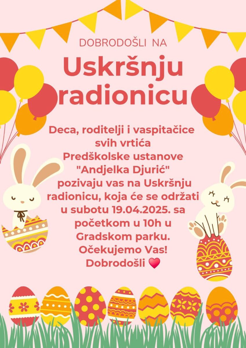 Povodom dolazećeg velikog hrišćanskog praznika Uskrsa, Predškolska ustanova „Anđelka Đurić“ organizuje Uskršnju radionicu u subotu 19. aprila sa početkom u 10 časova u Gradskom parku.