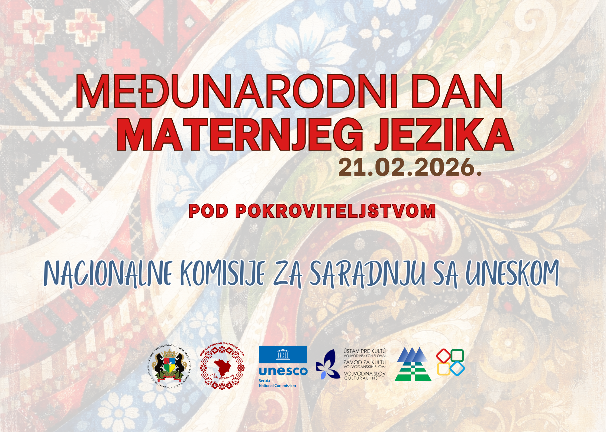 Opština Kovačica će 21. februara 2026. godine u 13 časova, u sali za sednice (Maršala Tita 50), obeležiti Međunarodni dan maternjeg jezika panel diskusijom „Četiri niti, jedan vez“ na temu „Glasovi mladih u višejezičnom obrazovanju“.
